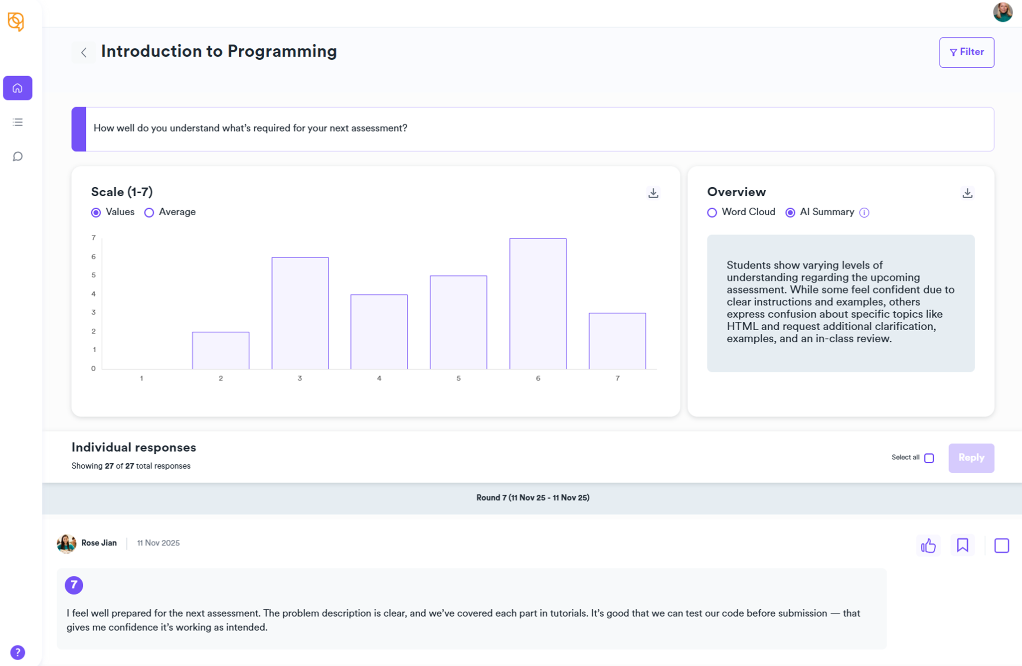 - Get an AI text summary from students’ comments (only available if you enabled additional text responses)