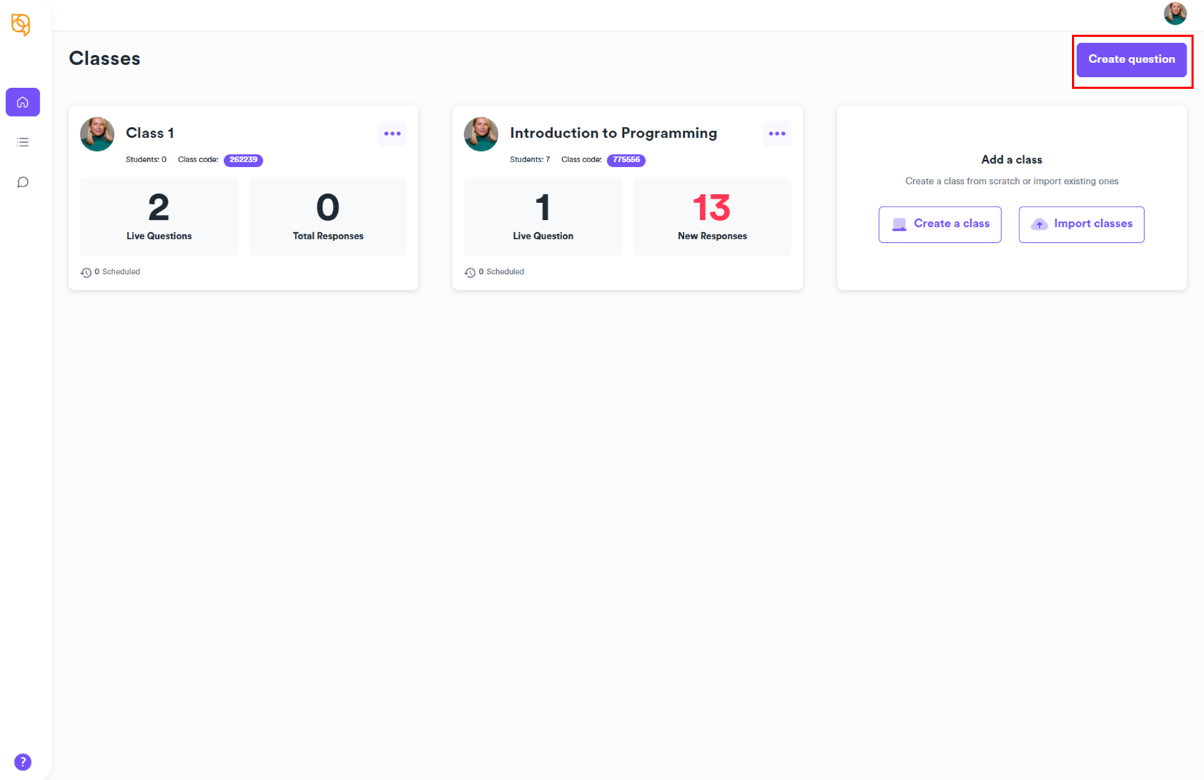A class in StudentSense is where you can add your students and create questions for check-ins, surveys, and get feedback.