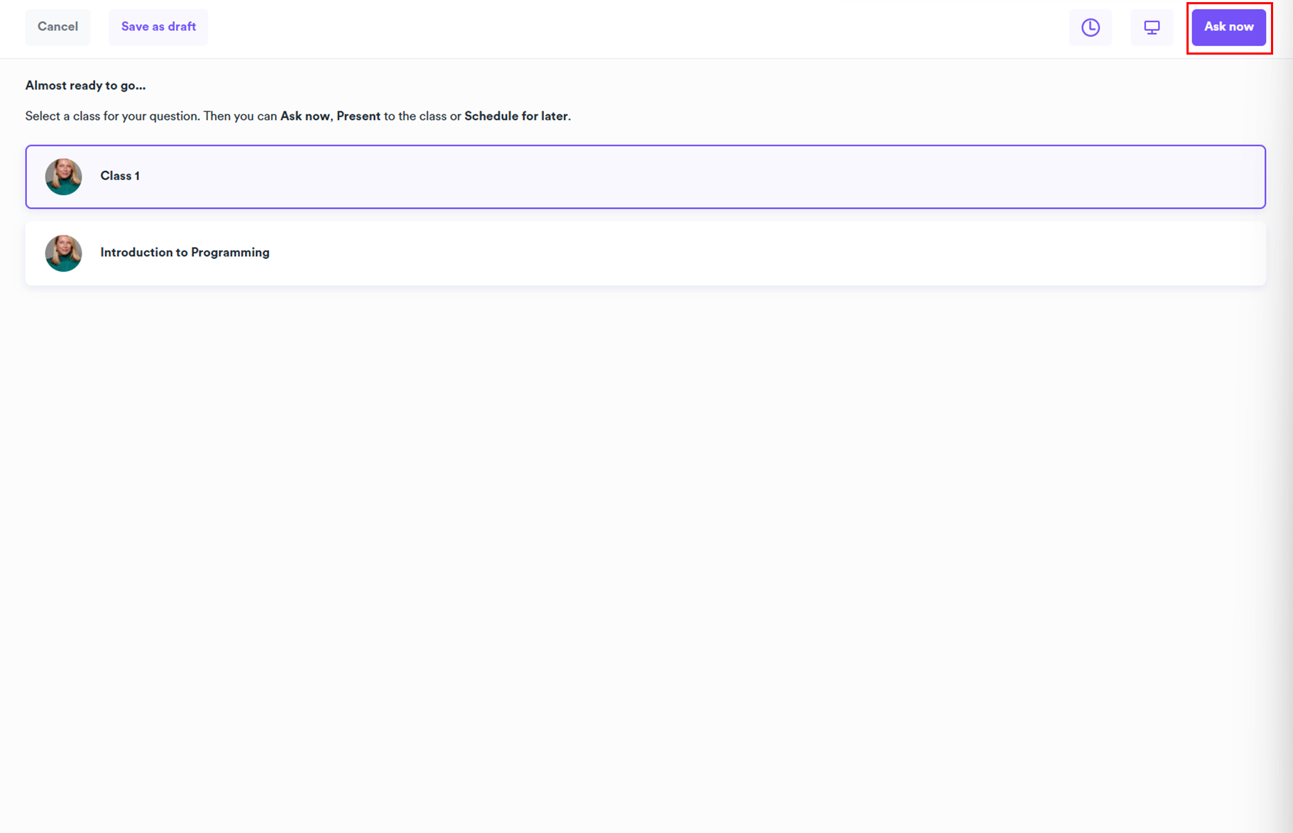 After that, decide when the question is available. If you click Ask now, the question will be available for your students to answer. Alternatively, you can select the schedule button which appears like a clock, to select a time which suits.