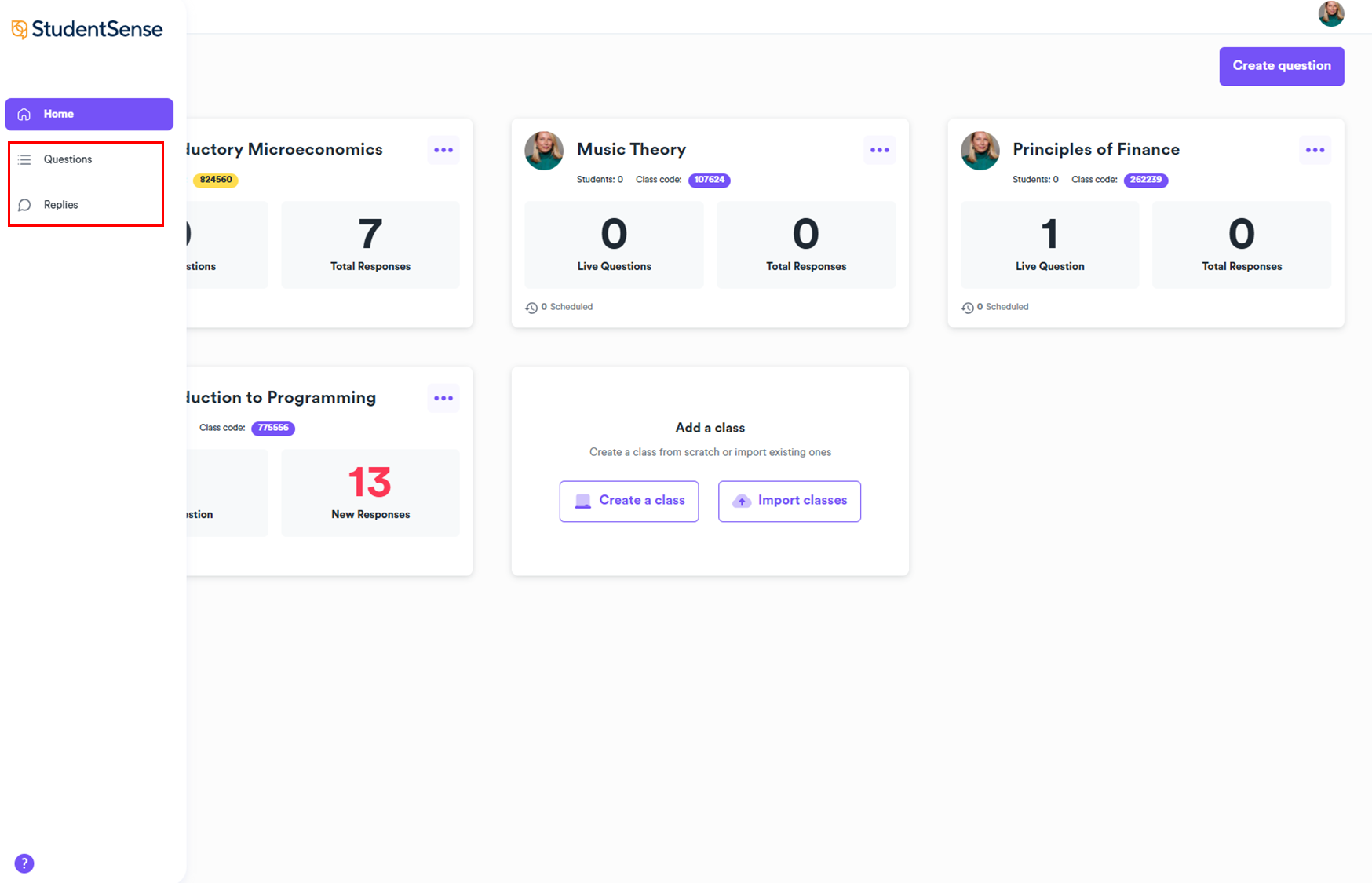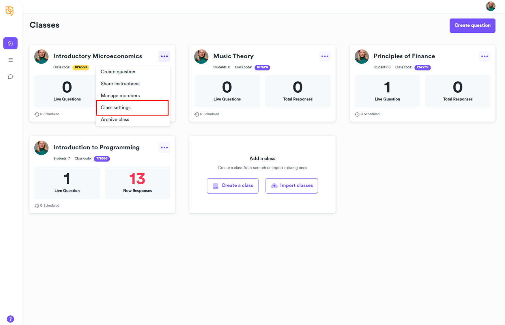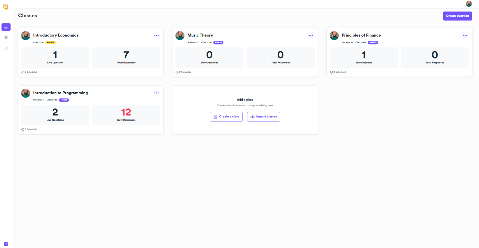 Aside from creating new classes or asking questions, in this page, you can also quickly get a view of number of live or scheduled questions for each class, as well as either the number of new or total number of responses that have been collected.