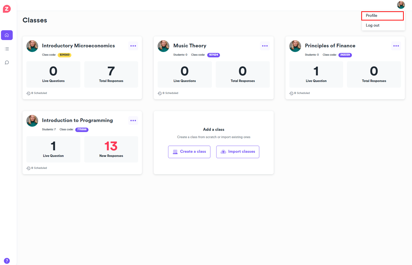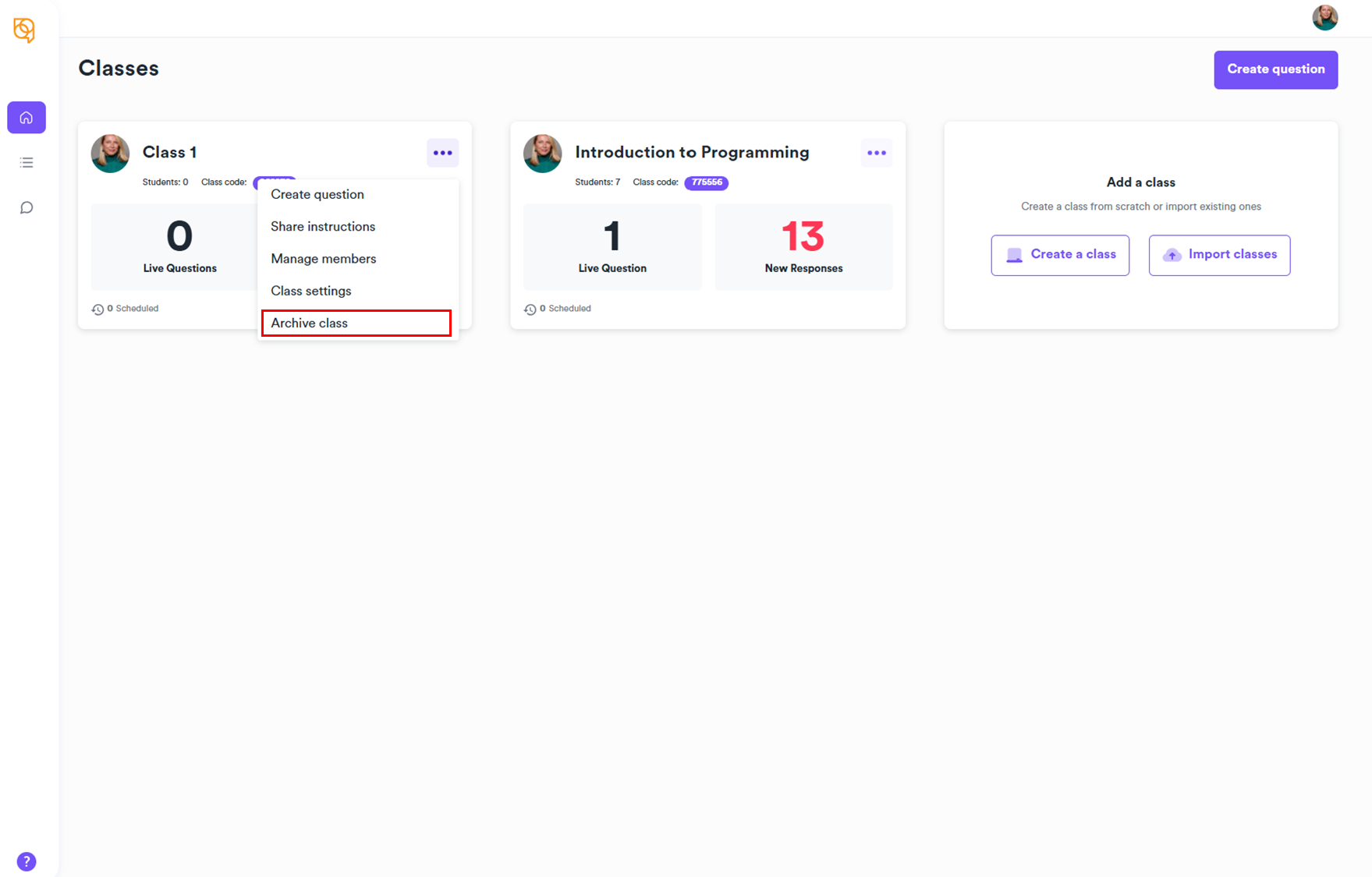 Archiving a class deactivates it and removes students, but you can still access all class data, including questions and past responses. You can unarchive the class to continue asking questions and getting feedback – though you will only be able to do this in the case of manually created class.