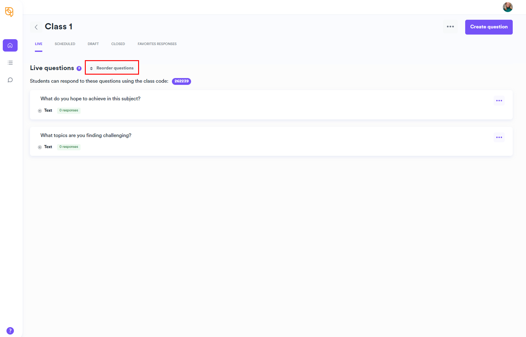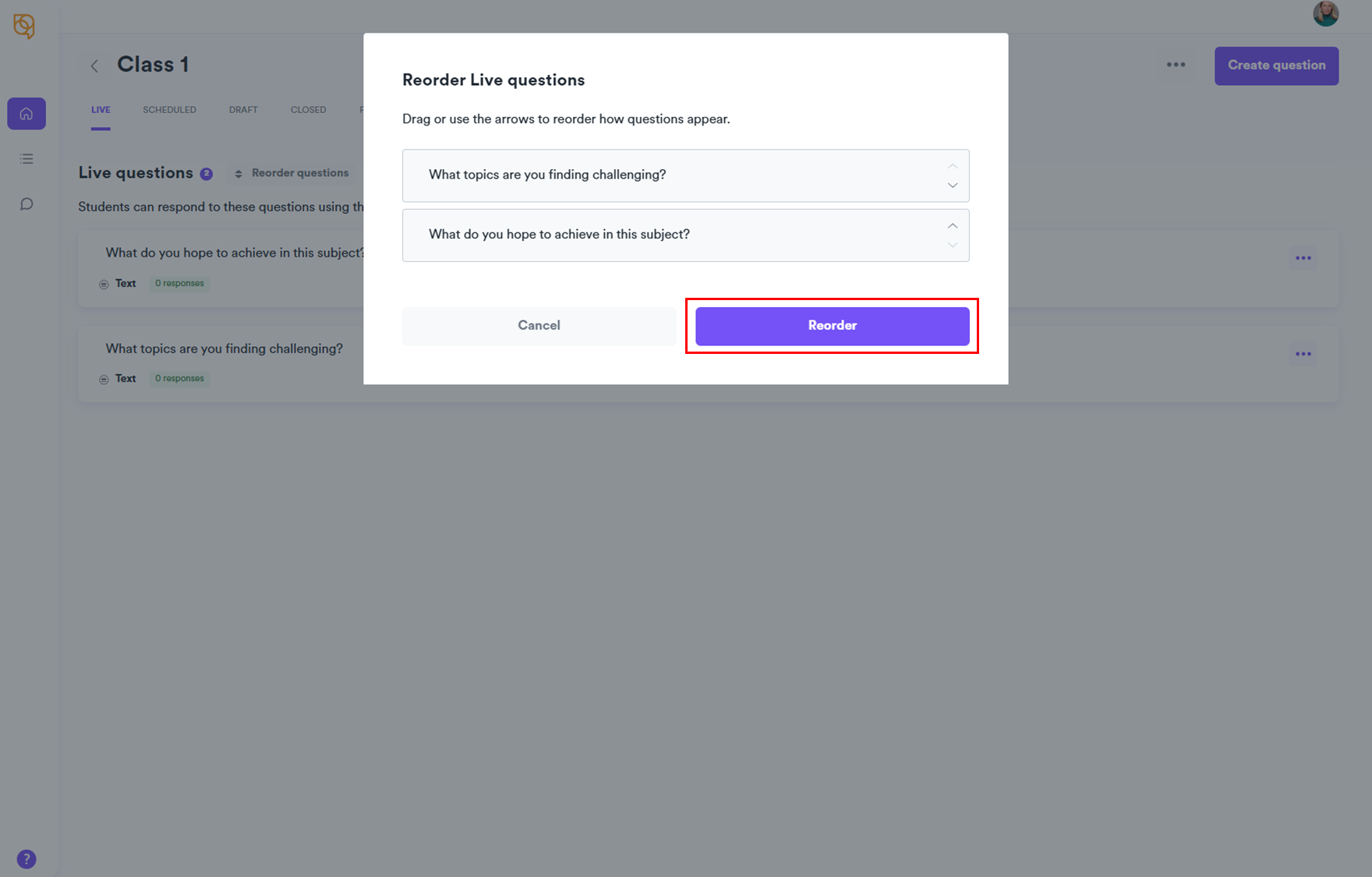Once you have asked more than one question in your class, you can choose to re-order how live questions will appear to your students when they join your class. To do so: