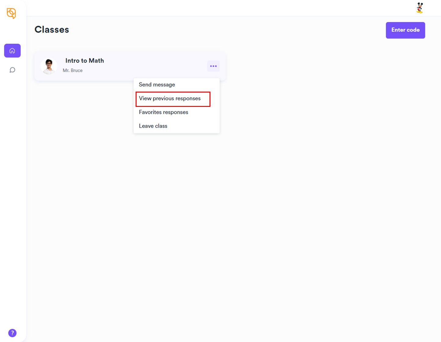 - In Classes, hover over the class you wish to view previous responses from.