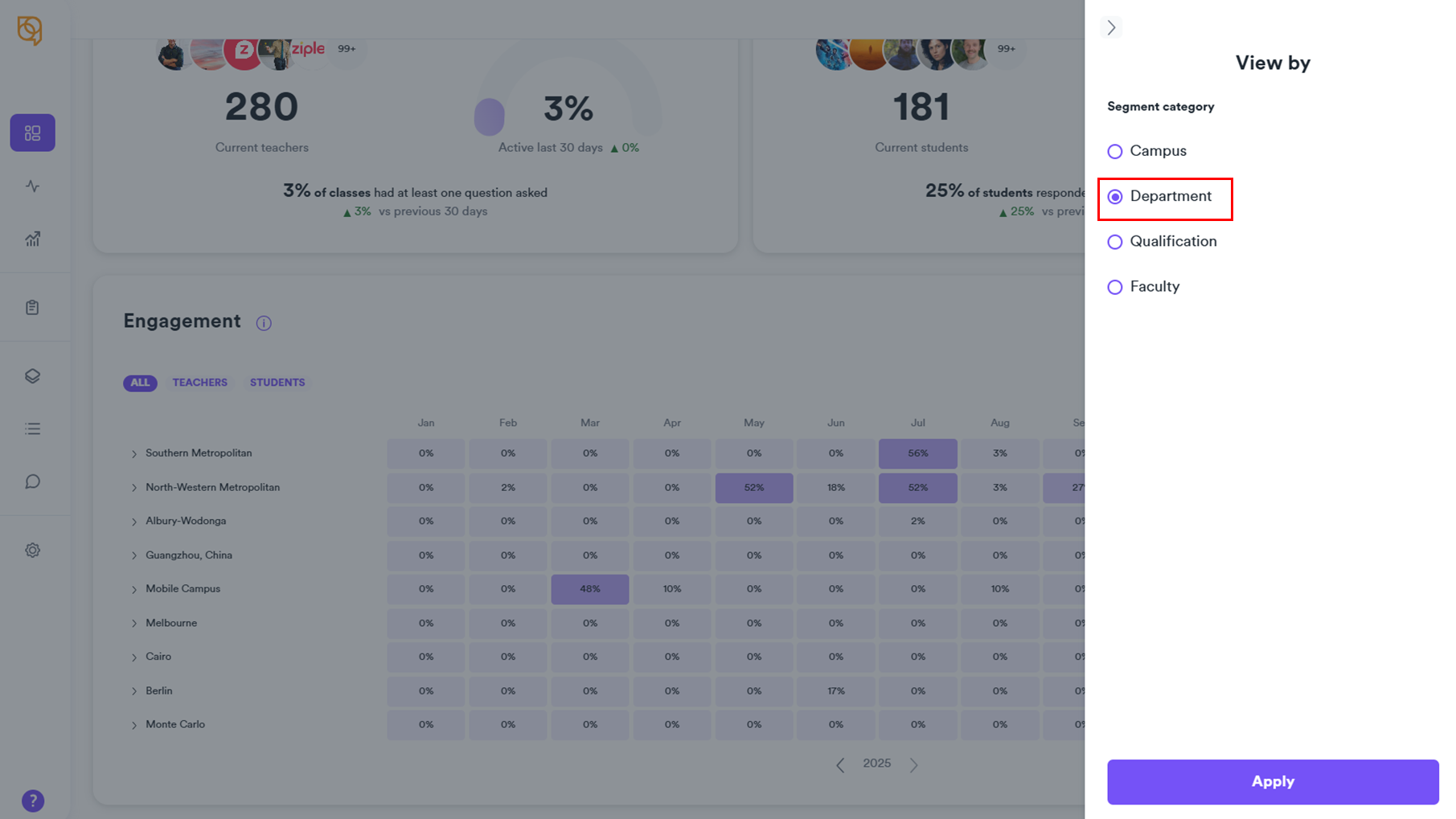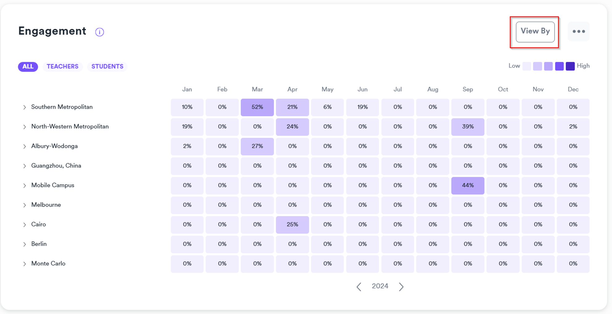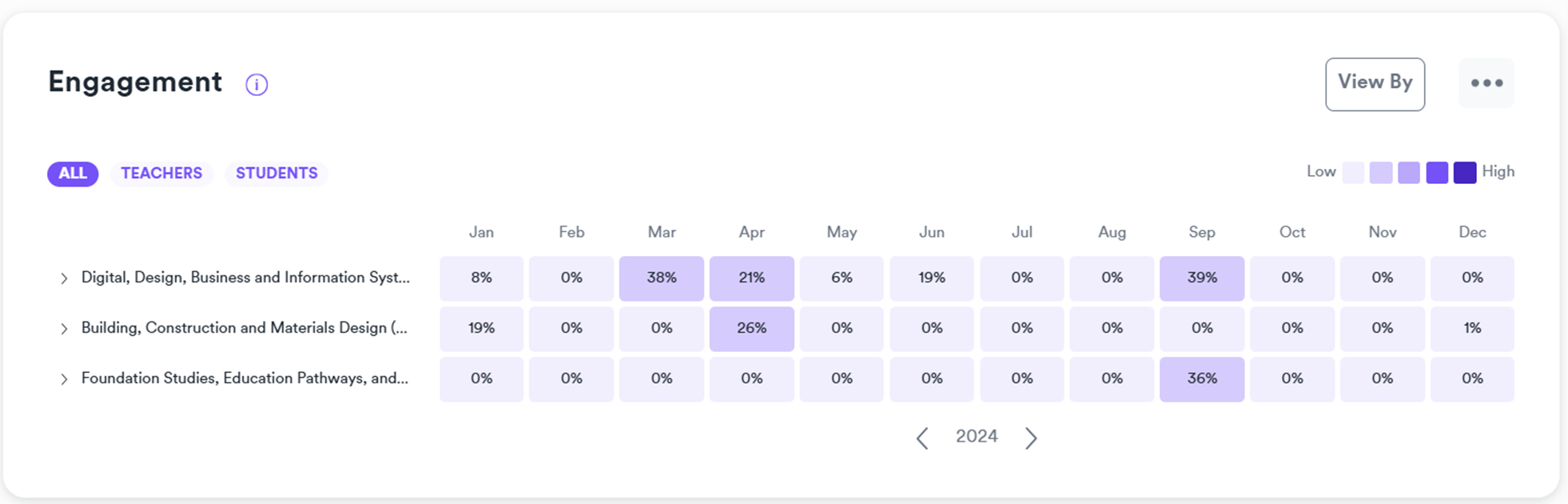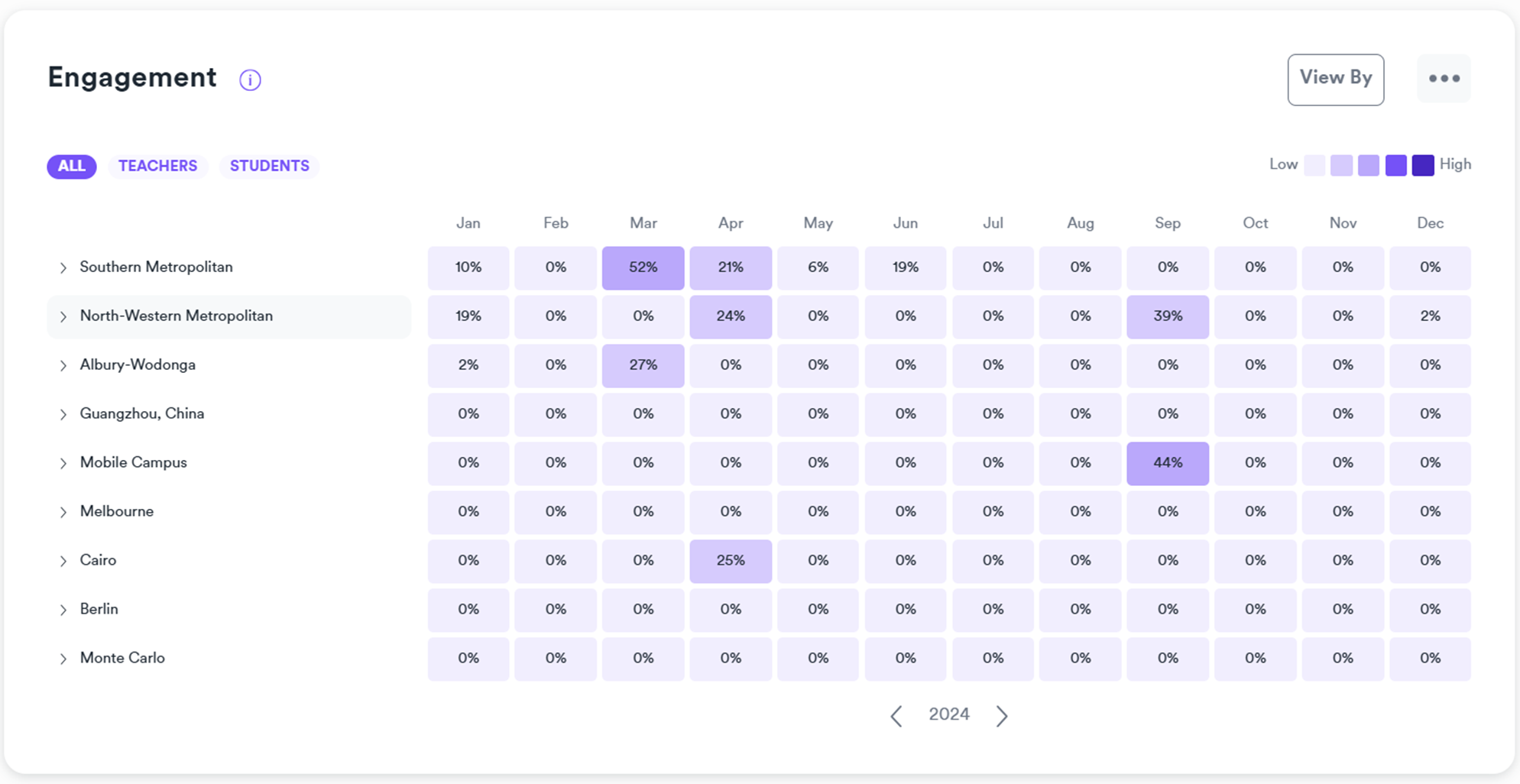 The Engagement heatmap shows the level of engagement of teachers, students, or both (i.e. ALL), across each of the segments or areas assigned to you.