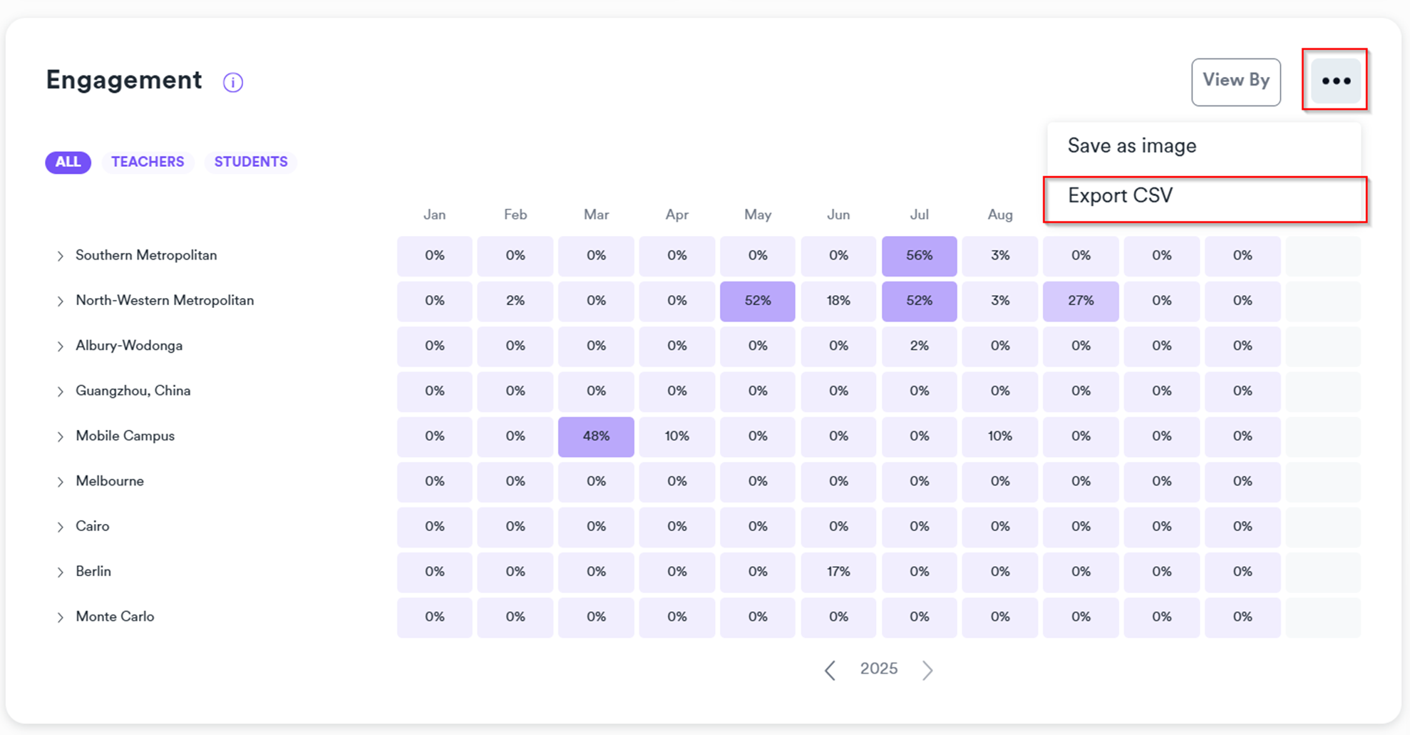You can export the data of any of the three tiles – Teachers, Students, and Engagement – by clicking on the three-dots in the top right corner of the tile and click Export CSV.