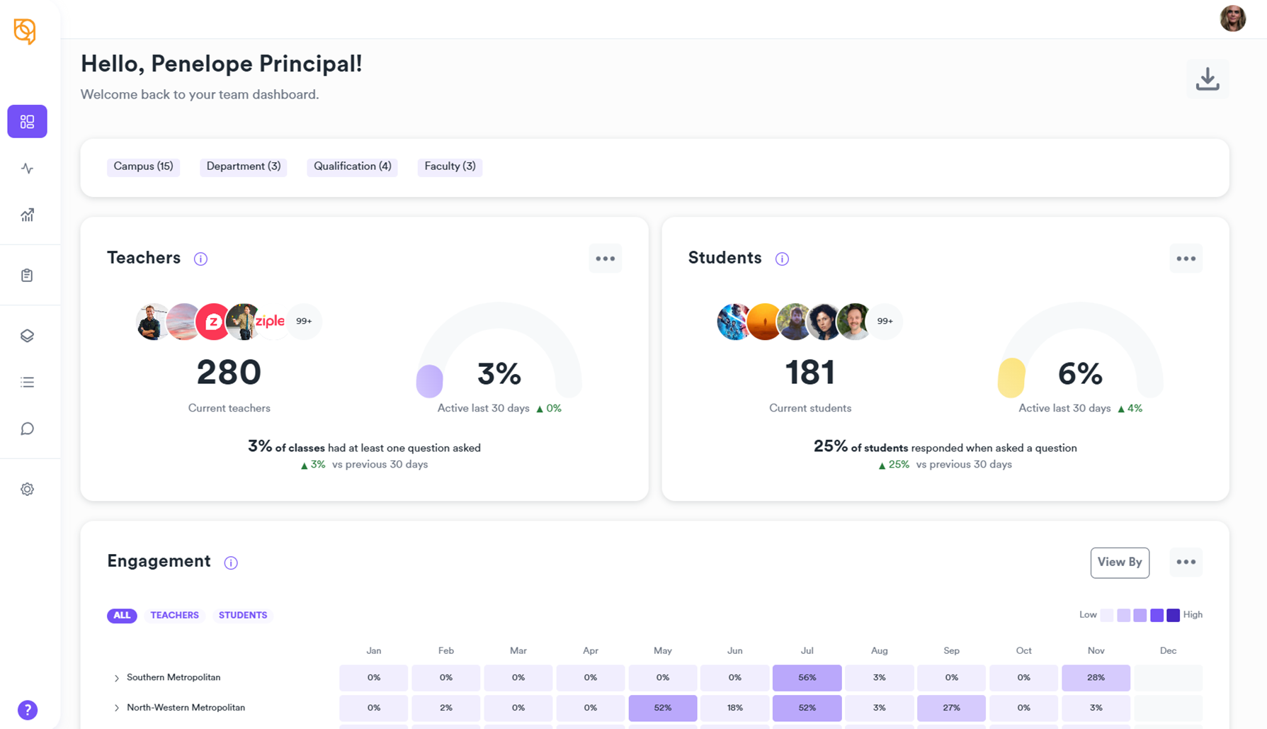 The Team Dashboard displays high level metrics and statistics about your team, including engagement level of teachers, students, and any segment that is available to you.