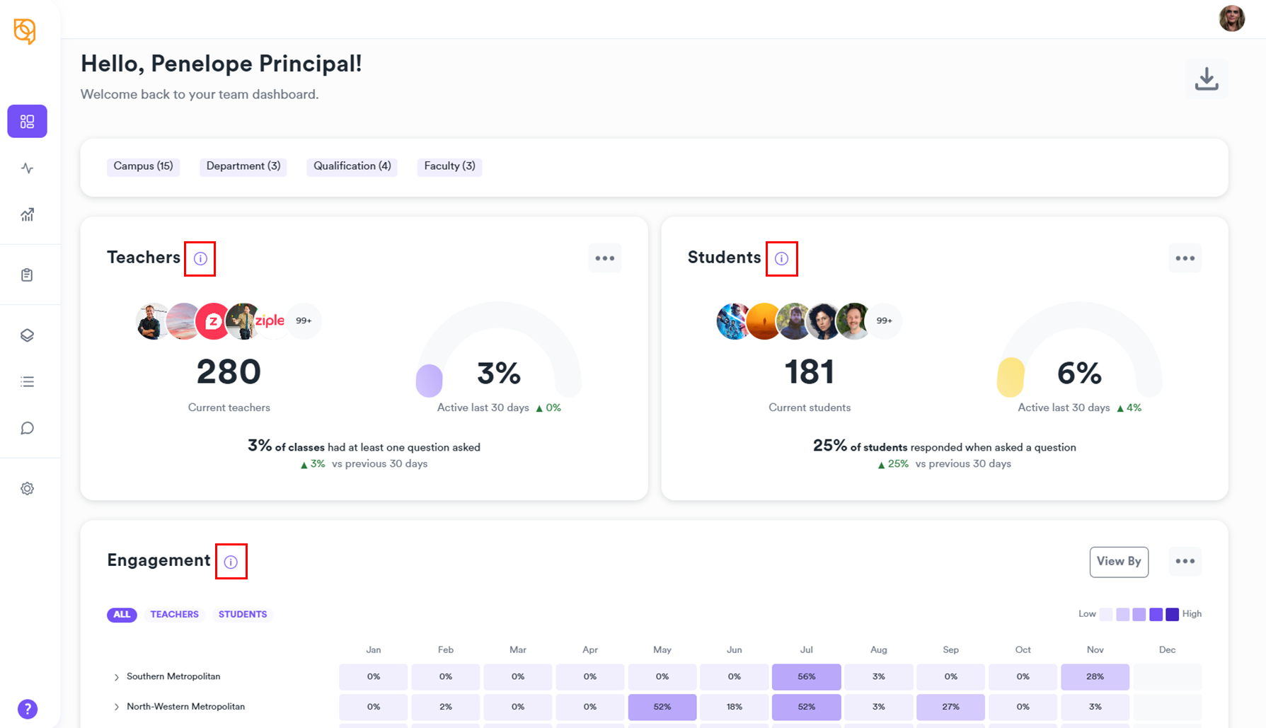 Click on the information icon (i) to get an explanation of each of the tiles (Teachers, Students, and Engagement).
