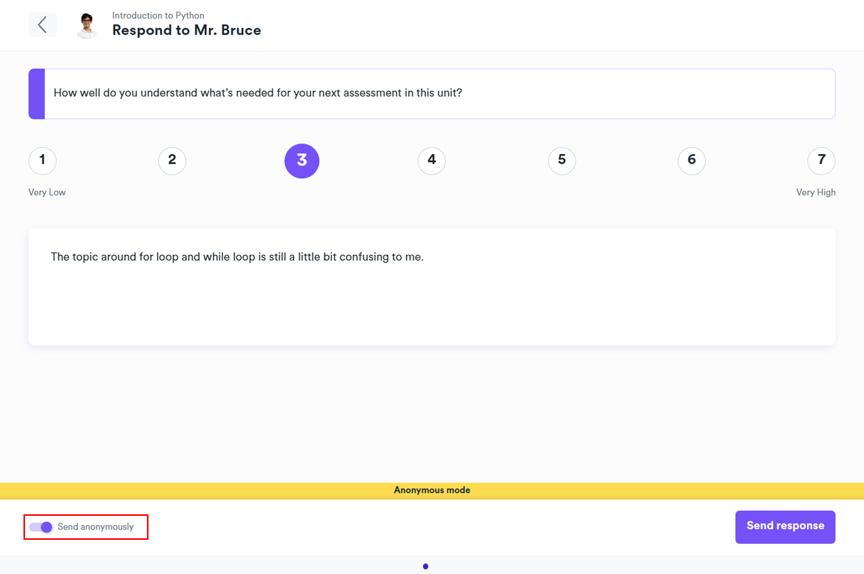 Choose if you want to send your response anonymously or identified by toggling on or off the Send Anonymously toggle before pressing send.