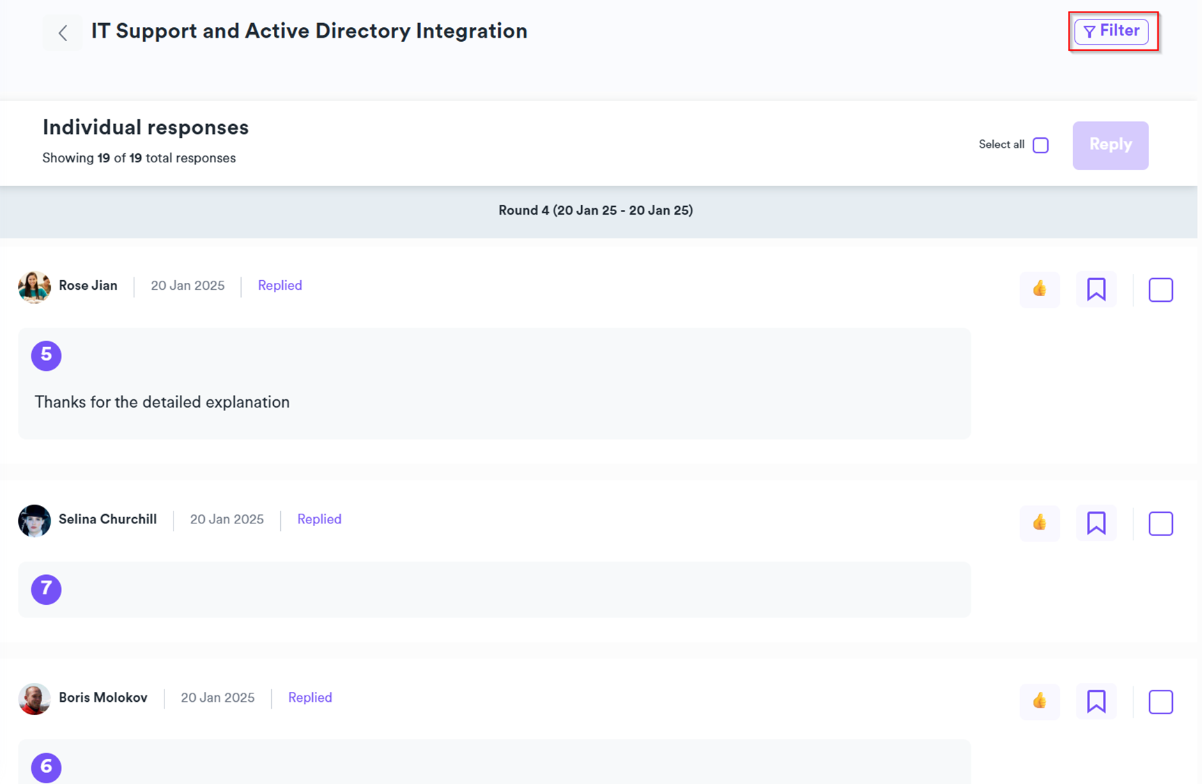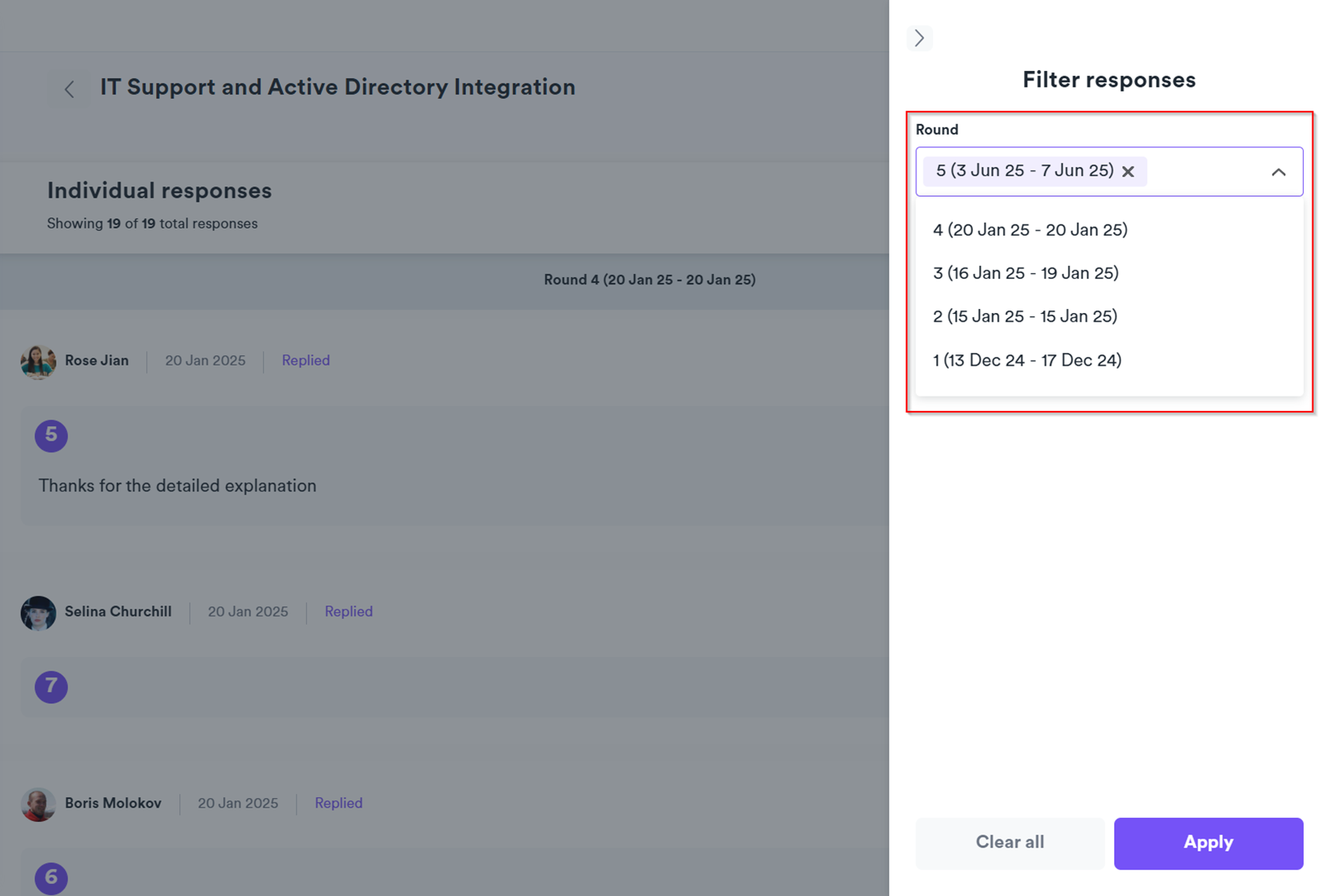 For all question types, if you’ve either run the survey multiple times or stopped and resumed the survey, you can filter the results between different “rounds” (i.e. the different time periods the survey was open for) by clicking on Filter and choosing the relevant round(s) – allowing you to filter responses for a particular time period.