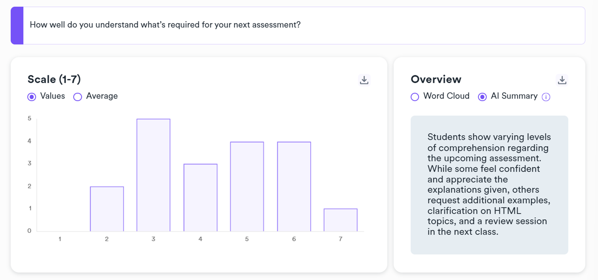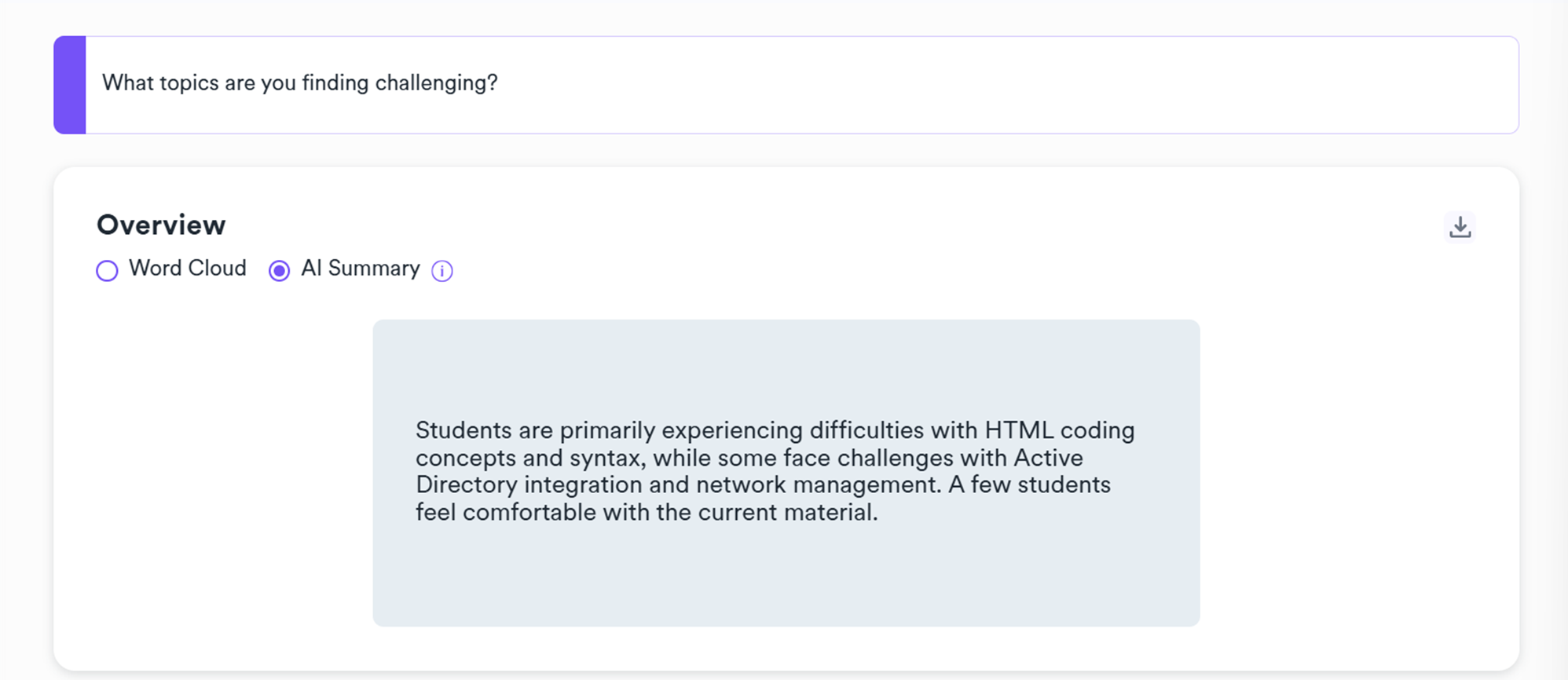 For text response questions, once you have gathered more than ten responses, StudentSense will give you an AI summary that quickly captures feedback from the class.