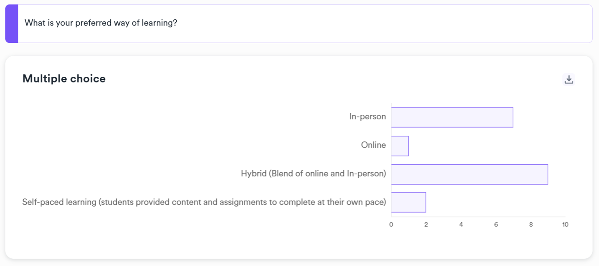 For multiple choice questions, a simple bar chart is provided for quick summary: