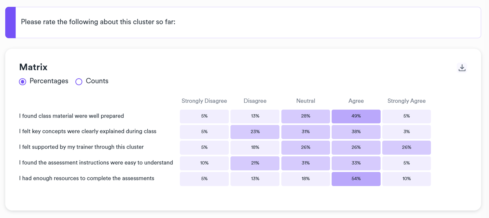 For matrix type questions, you can view the results summary in a percentage heatmap: