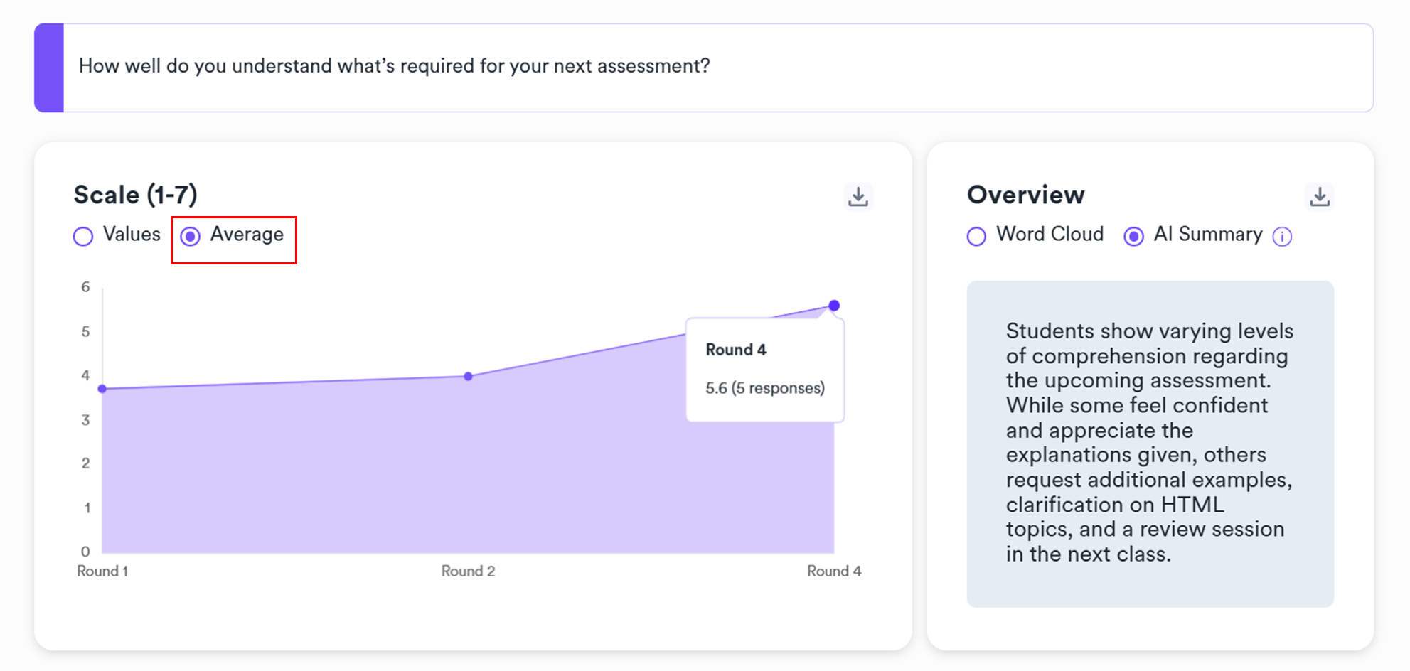 More importantly, if you’ve closed and repeated the same scale question multiple times, you can compare the average results between different rounds by selecting the “Average” option.
