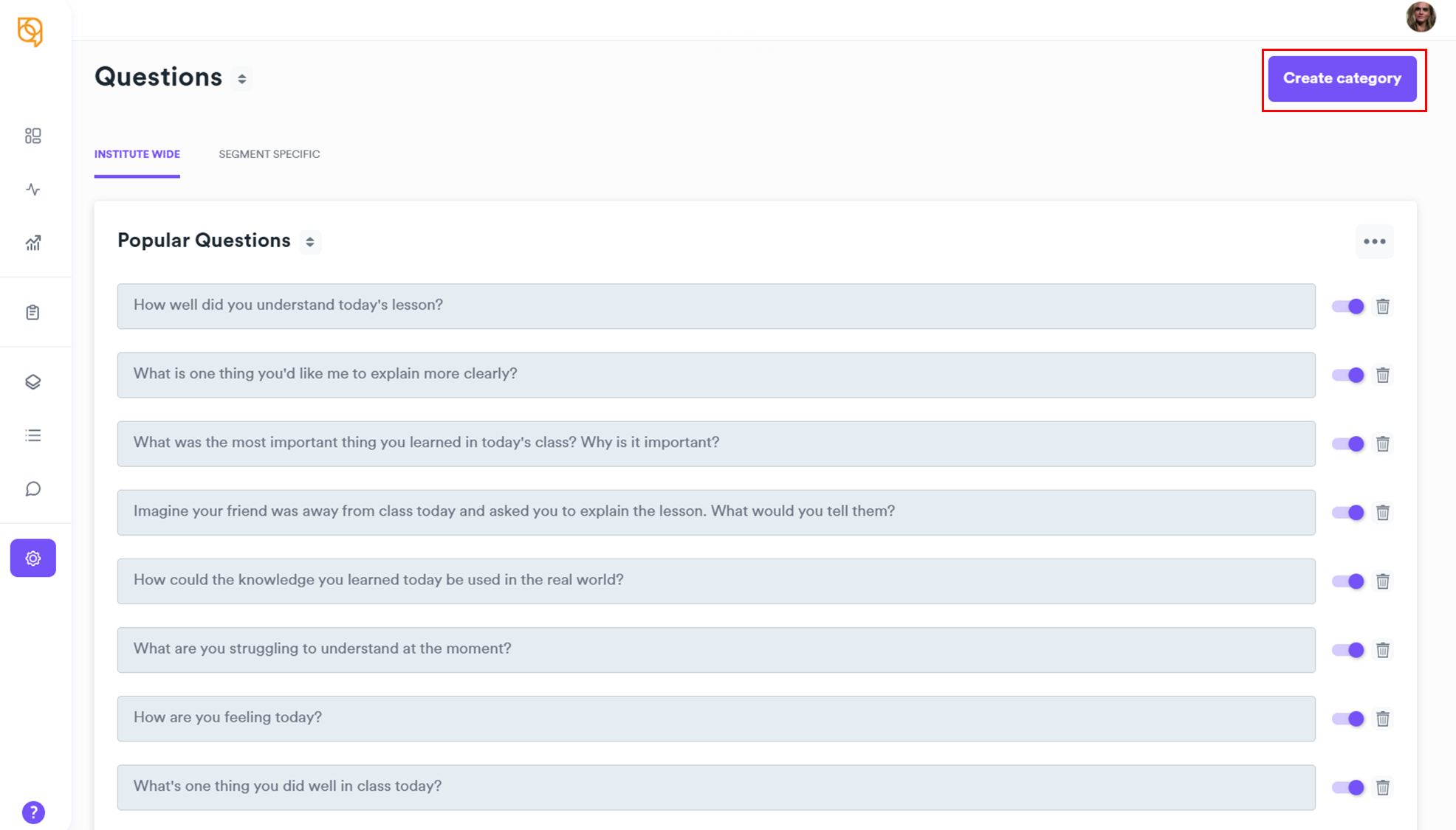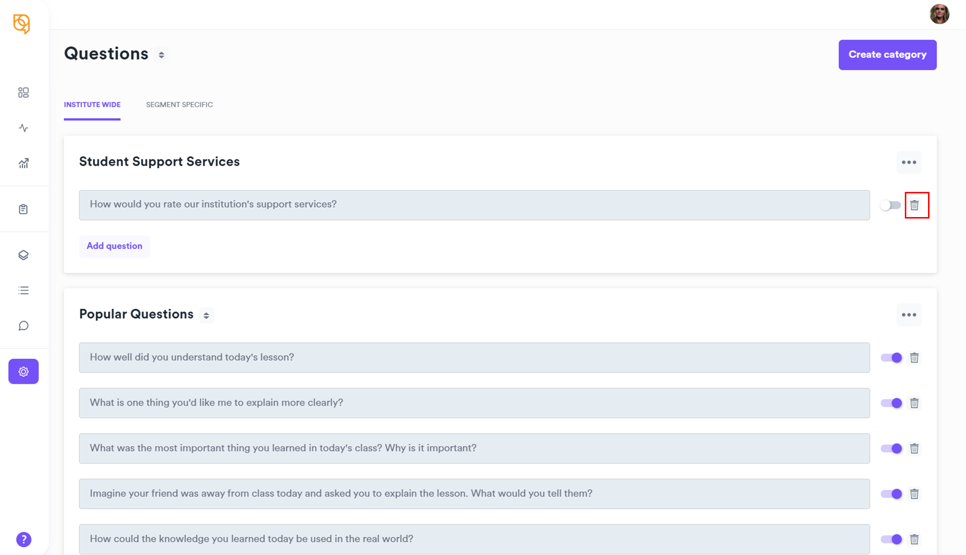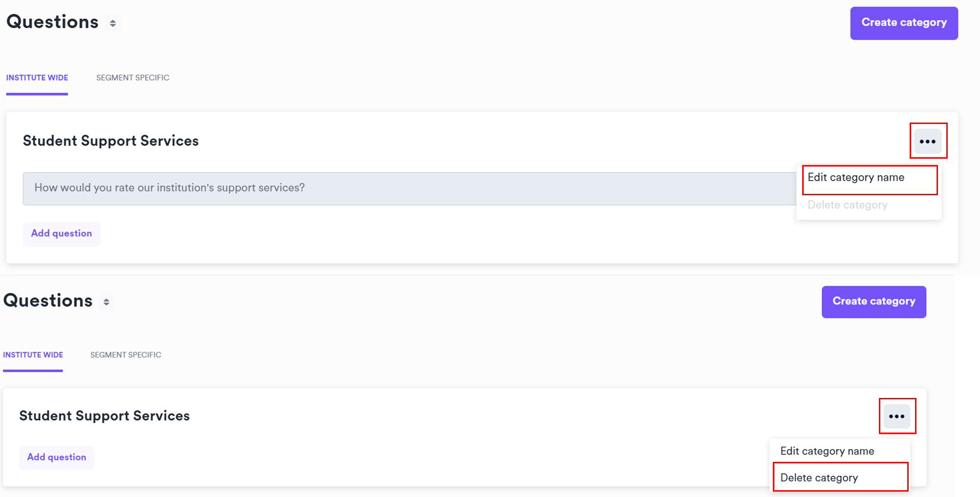 - You can only delete a category once all the questions under that category are deleted. To delete a category, select the three dots next to the category and select Delete category.