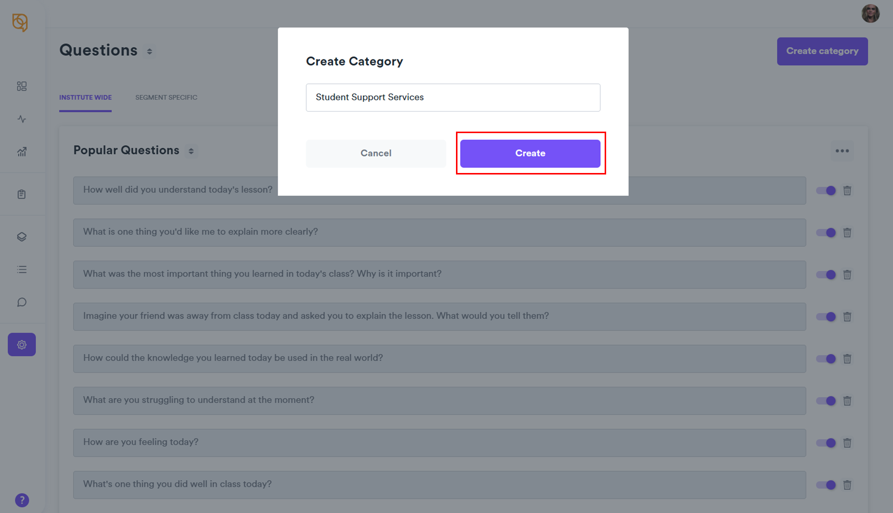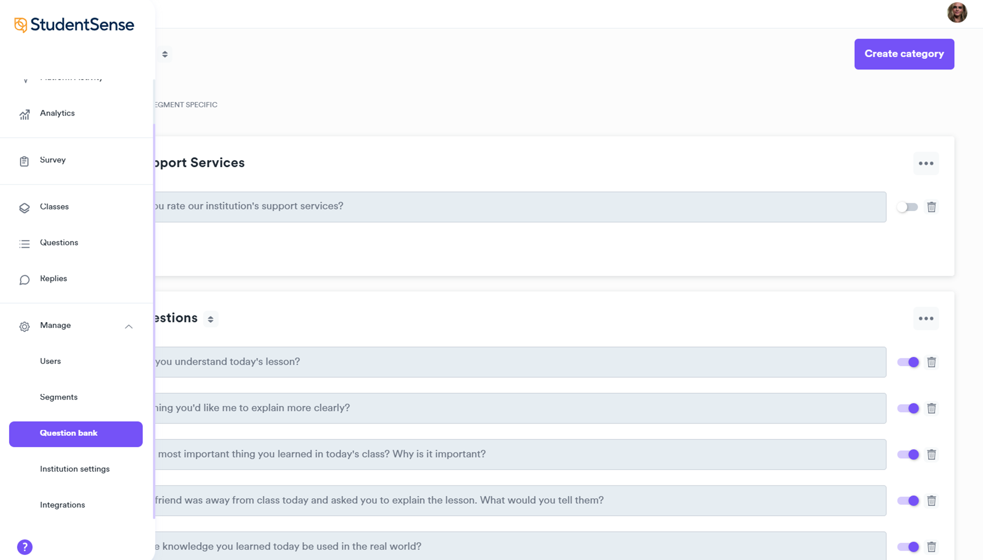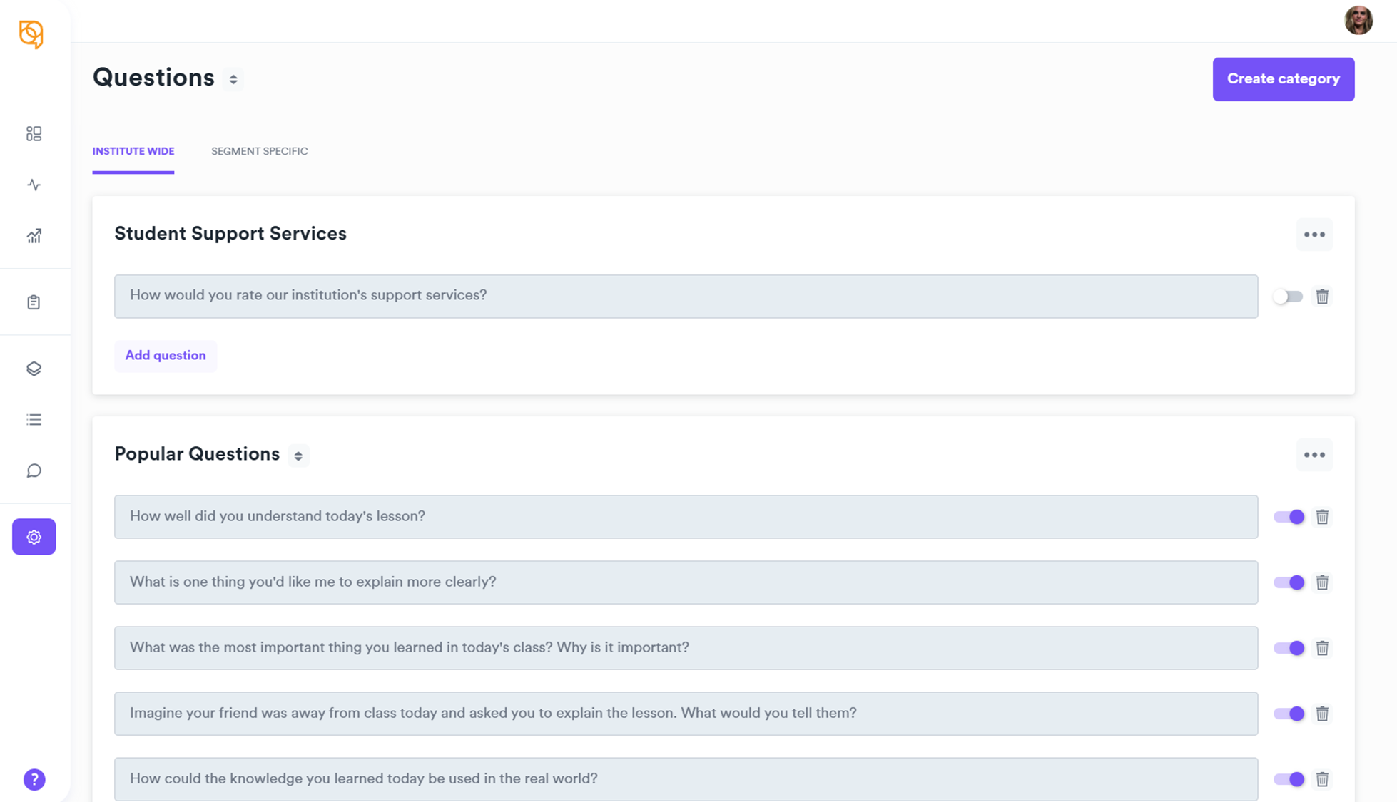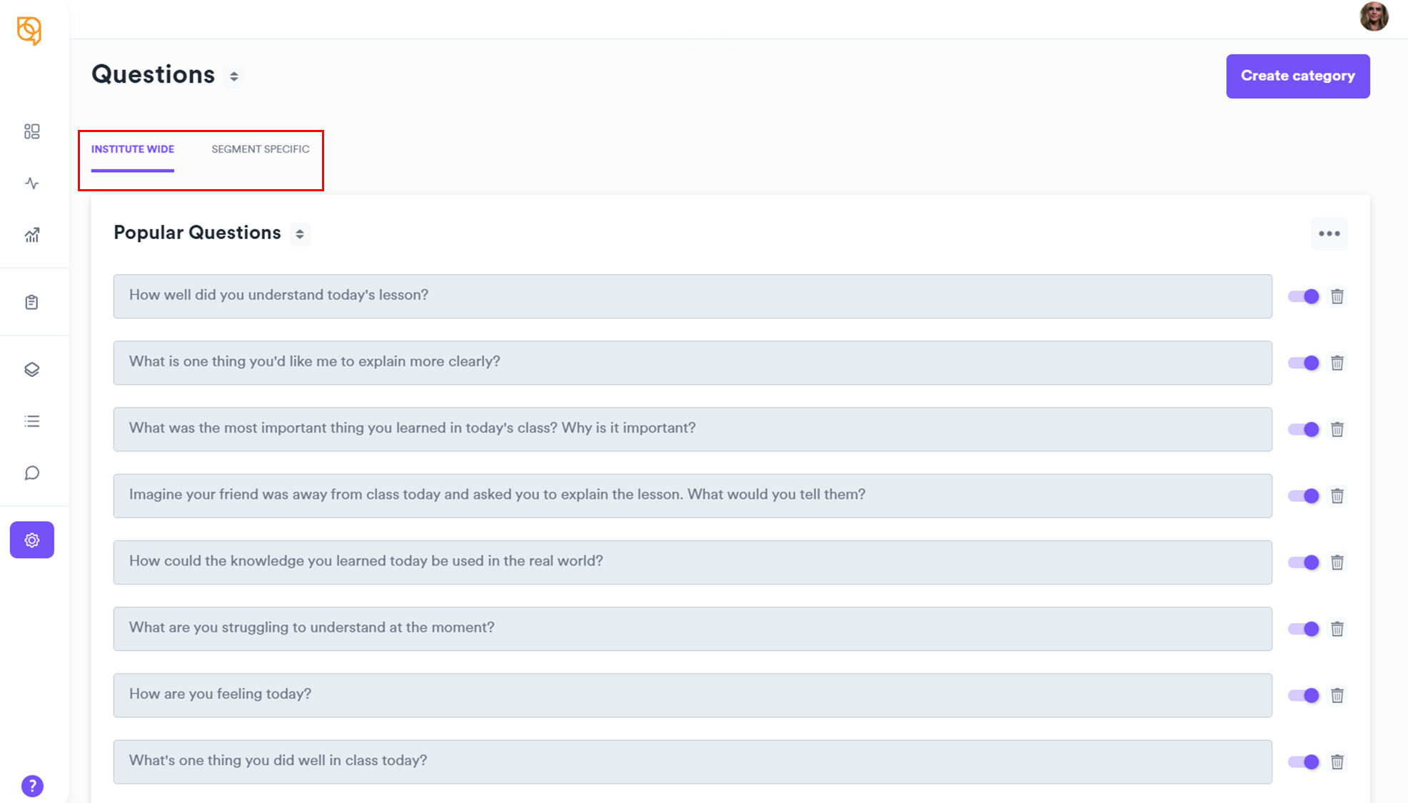 - You can only delete a category once all the questions under that category are deleted. To delete a category, select the three dots next to the category and select Delete category.