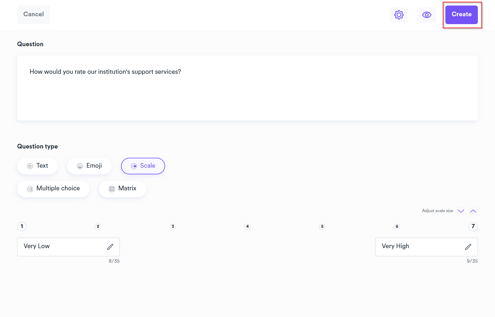 - Then, create your question. For more information on question creation, see Advanced question customisation. Once done, click Create.